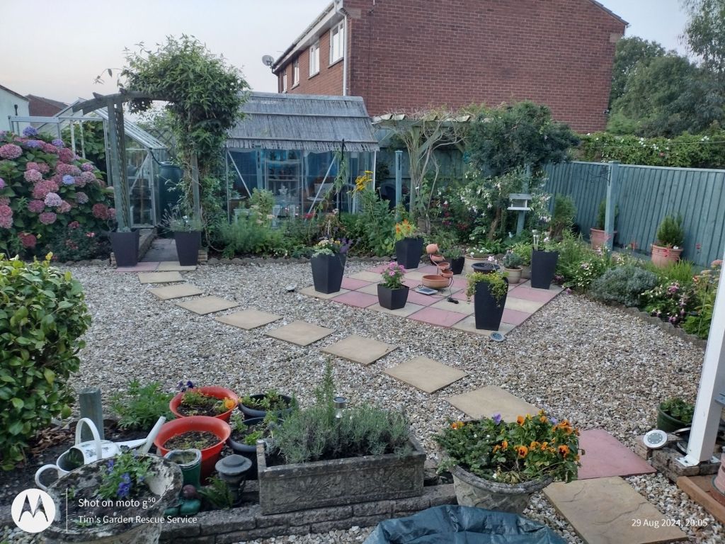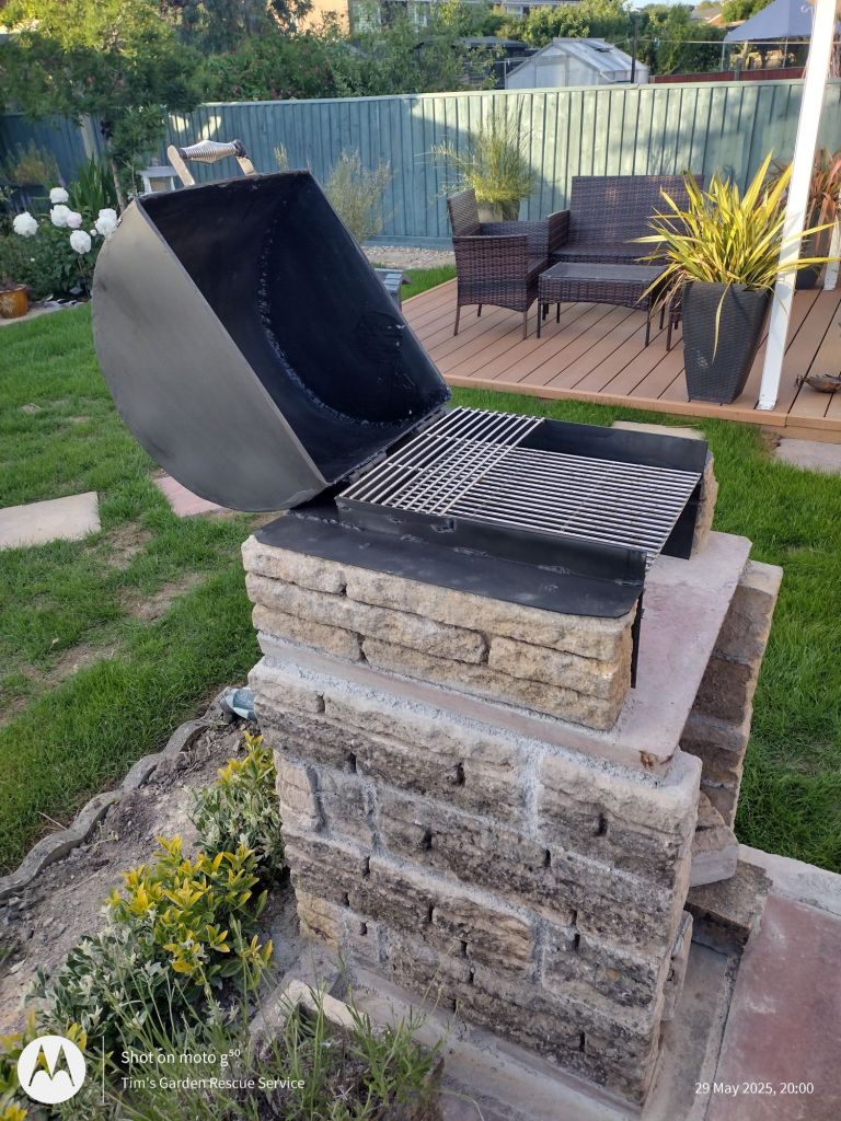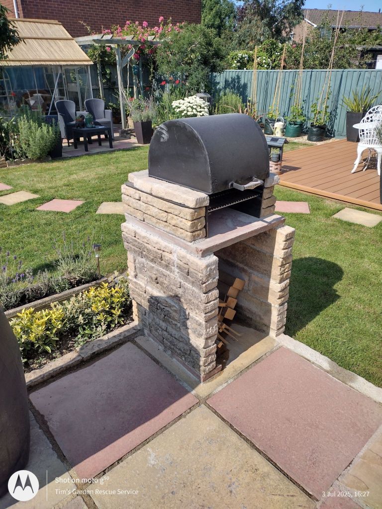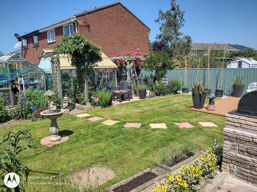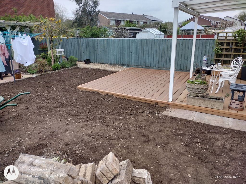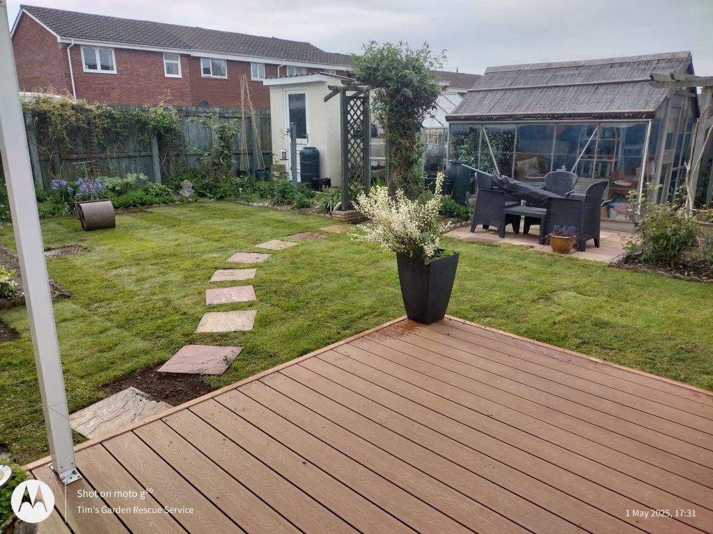 Fed up with all the gravel, these clients asked me to replace it all with turf! And to move the slabs, extend the decking and reduce the area of flowerbeds. They also wanted a smaller hedge and a barbecue.