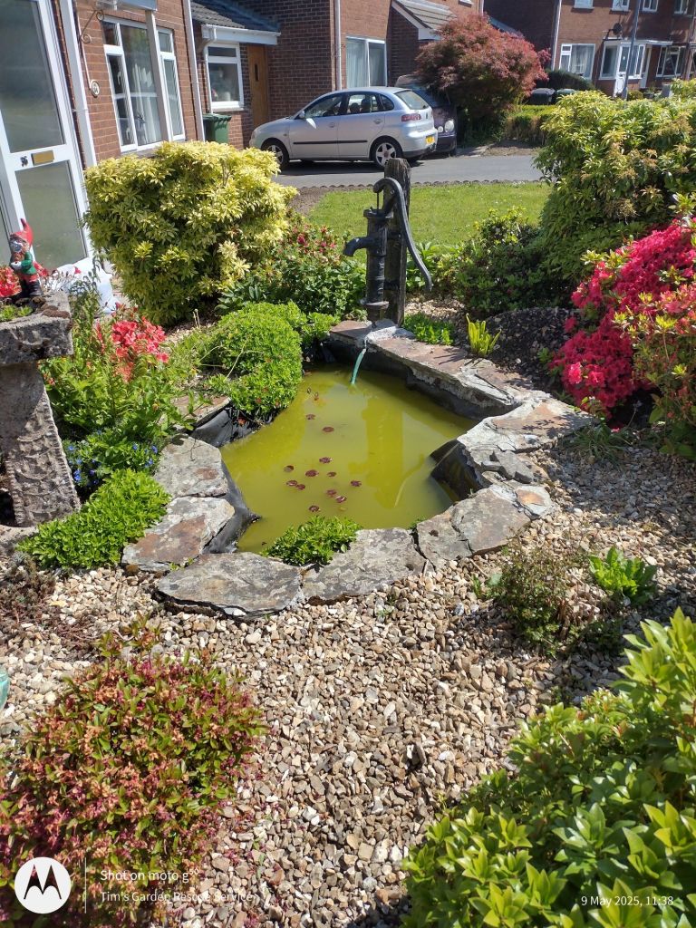 In order to save money it was decided that I remove the soil from the flowerbed at the front of the house and replace it with all the gravel. I used the soil from the front bed to level out the back before laying the turf on it. I also relined the pond as it was leaking and fitted a new pump with a UV filter to clean the water as it has fish in it. And got a feature fountain for the back garden.