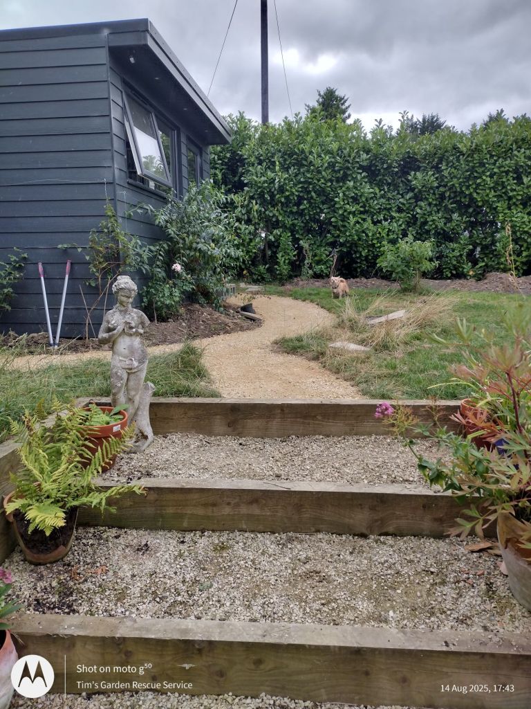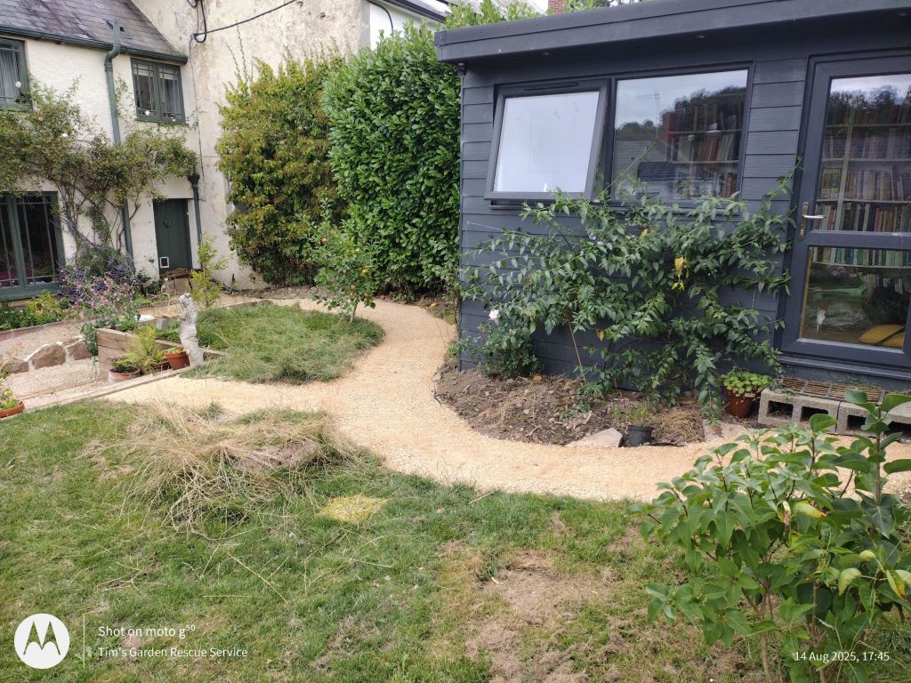 Continuing on from an area that I landscaped last year in this garden and laid hoggin on, I created a path up to the cabin so that the regular foot traffic won’t make a muddy mess in the winter. Hoggin is otherwise known as self binding gravel and is made of clay, sand and gravel. It can be used for both paths and drives.